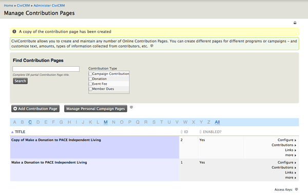 Click on the CiviCRM button in the grey menu bar (top). Click on Contributions -> Manage Contribution Pages. Here you'll find a listing of all existing Contribution pages. Select a Contribution page that is closest to the Contribution page you'd like to create. Go to the far right column and click on more -> Make a Copy. This will effectively clone the existing Contribution page and all its settings. Click on Configure -> etc. to make changes to the Title and Settings, Contribution Amounts, Membership Settings, Thank-you and Receipting, etc.